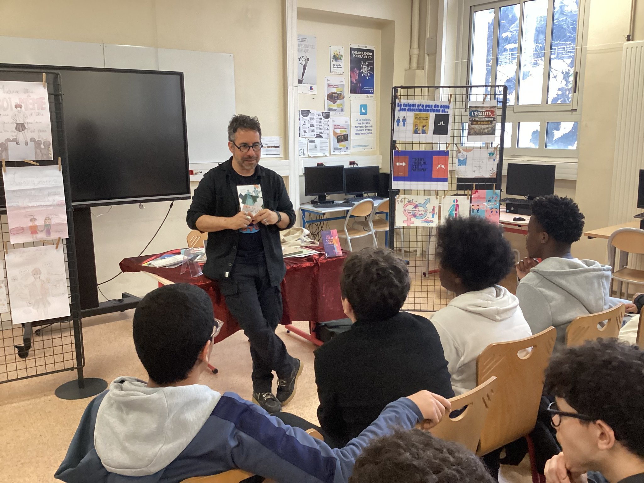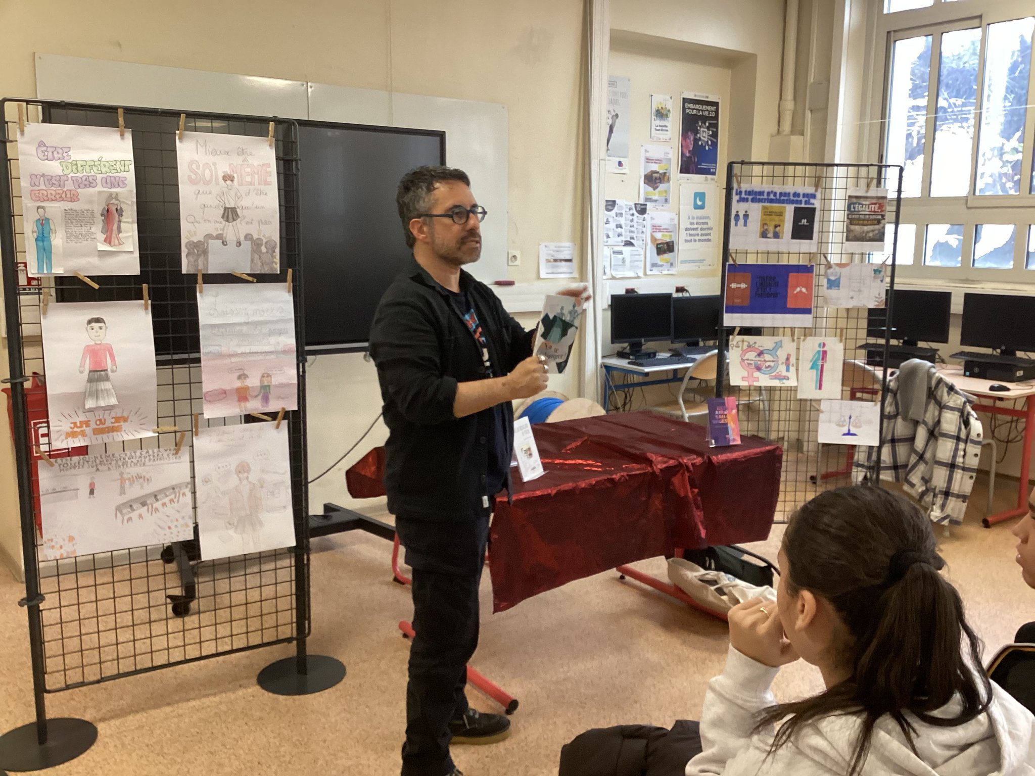 Les élèves de 3è2 et 3è3 ont pu présenter à Thomas Scotto les travaux qu'ils avaient préparés en amont de la rencontre, sous l'impulsion de leurs enseignantes  :  des affiches autour de la thématique de l'égalité entre les genres, du harcèlement, des différences ; des textes d'invention qui permettent de donner une suite au livre. Thomas Scotto a également présenté aux élèves les nombreux livres qu'il a écrits ou auxquels il a participé depuis 1998, date de parution de son premier texte.