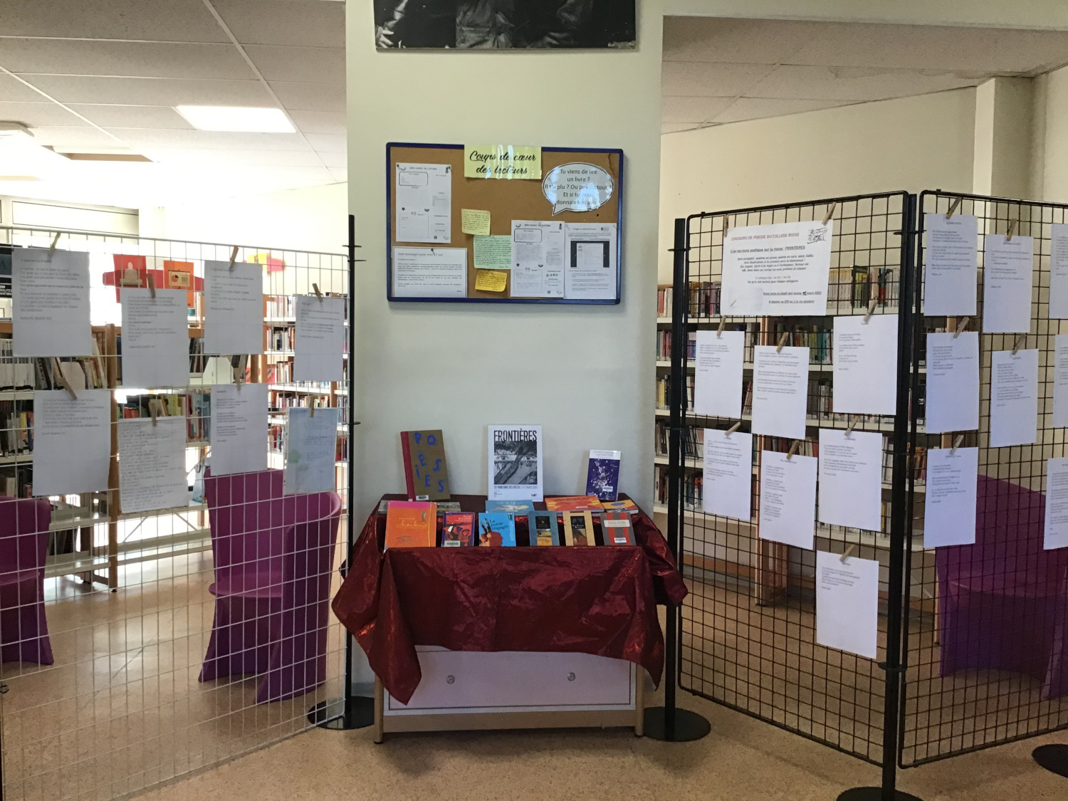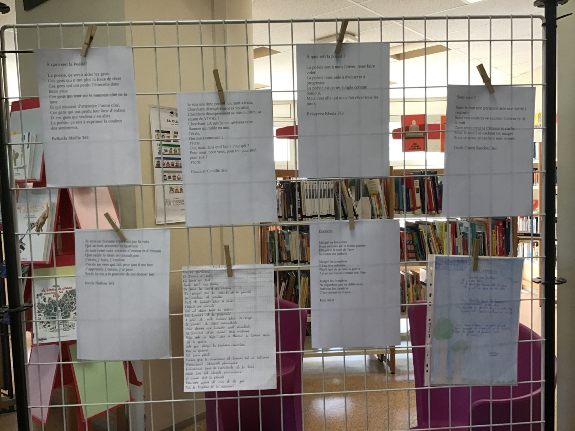 L'intégralité des poèmes sont exposés au CDI, sur le stand où sont mis à l'honneur quelques poètes contemporains.