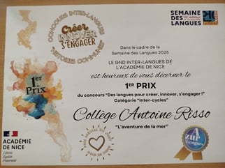 Quatre élèves ambassadeurs ont enregistré une présentation du projet en Langue vivante et trois d'entre eux se sont rendus au collège Villeneuve de Fréjus, accompagnés de Mmes Bartolini et Portales où ils ont remporté le 1er prix dans la catégorie inter-cycles ainsi que le prix "Coup de cœur du jury" pour leur production.